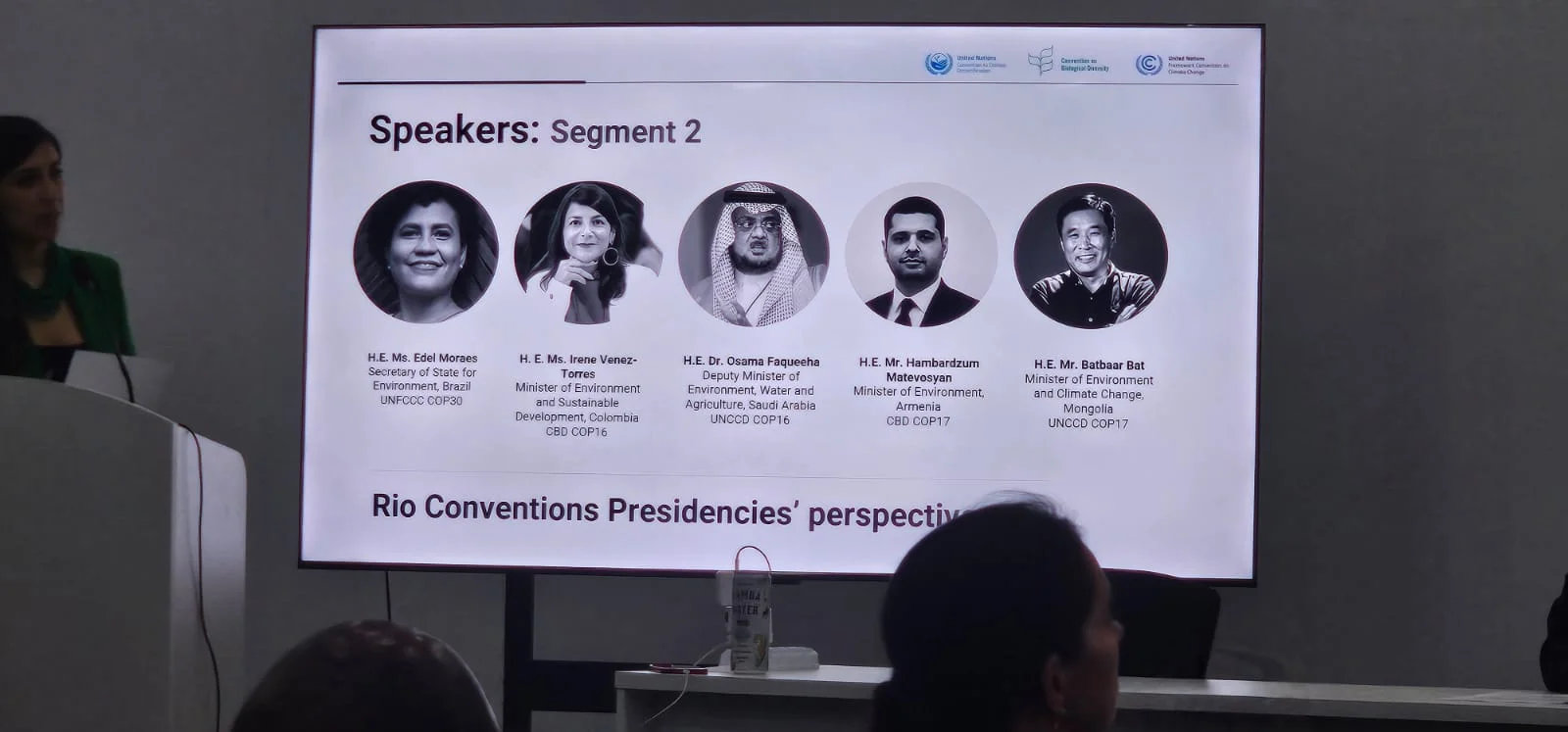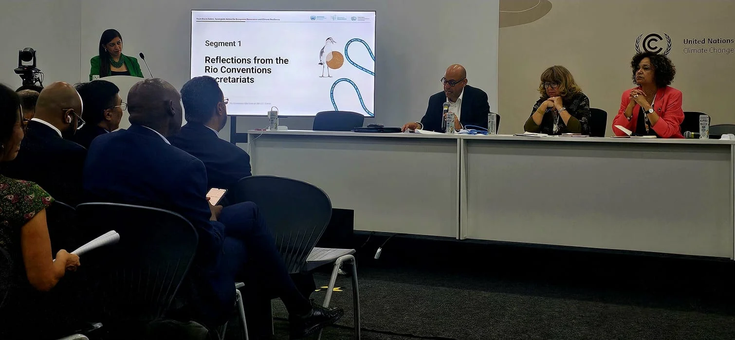 La delegación de Fundación Natura estuvo conformada por Rosa Montañez, directora ejecutiva; Yariela Zeballos, vicepresidenta de la Junta Directiva; y Vilna Cuéllar, Gerente de Proyectos Especiales, quienes han participado en sesiones vinculadas a adaptación, financiamiento climático, sinergias entre convenios ambientales y participación comunitaria.