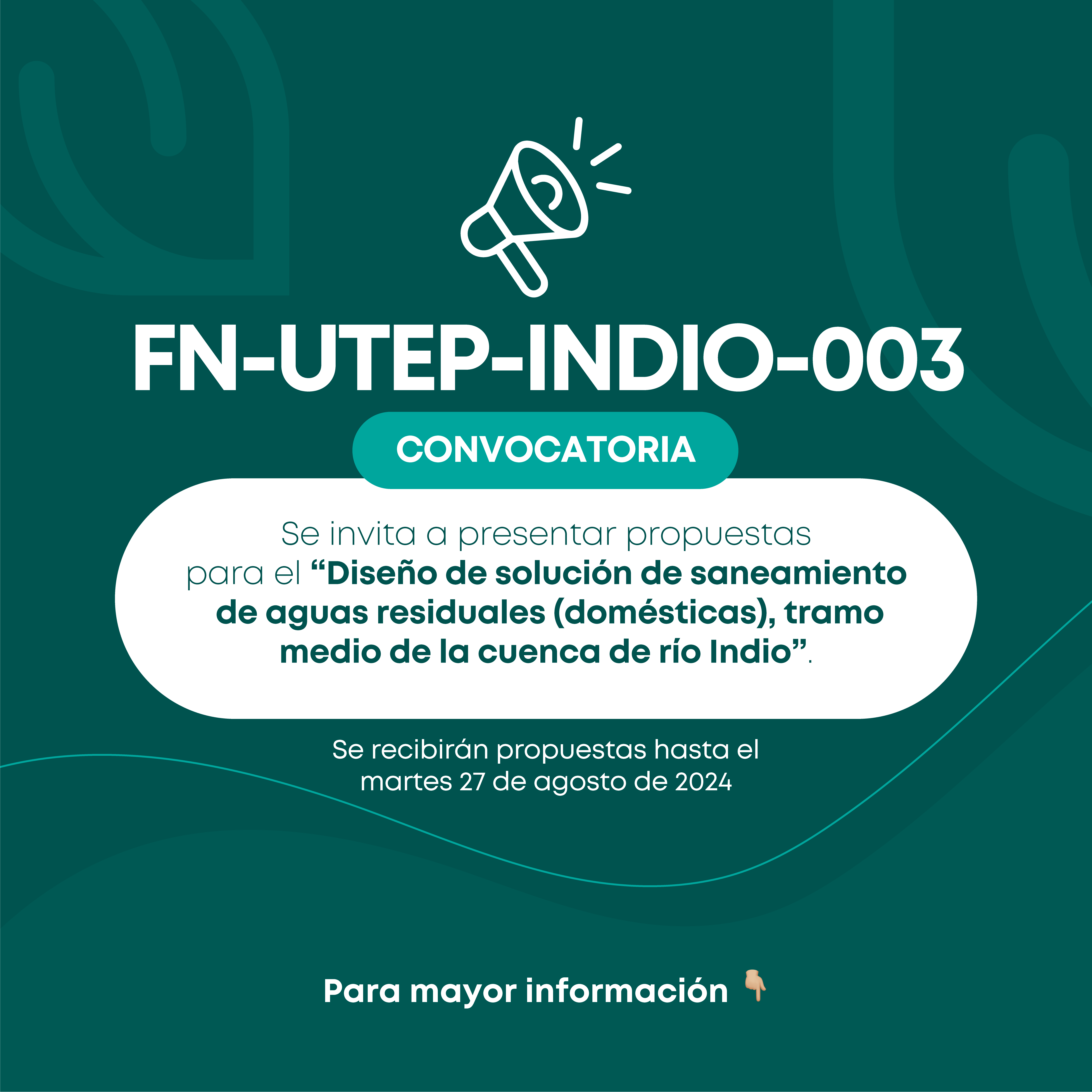 Se invita a toda organización debidamente constituida (Empresas Consultoras, Organizaciones No Gubernamentales), a presentar propuesta para el proyecto «Diseño de solución de saneamiento de aguas residuales (domésticas), tramo medio de la cuenca de río Indio».
