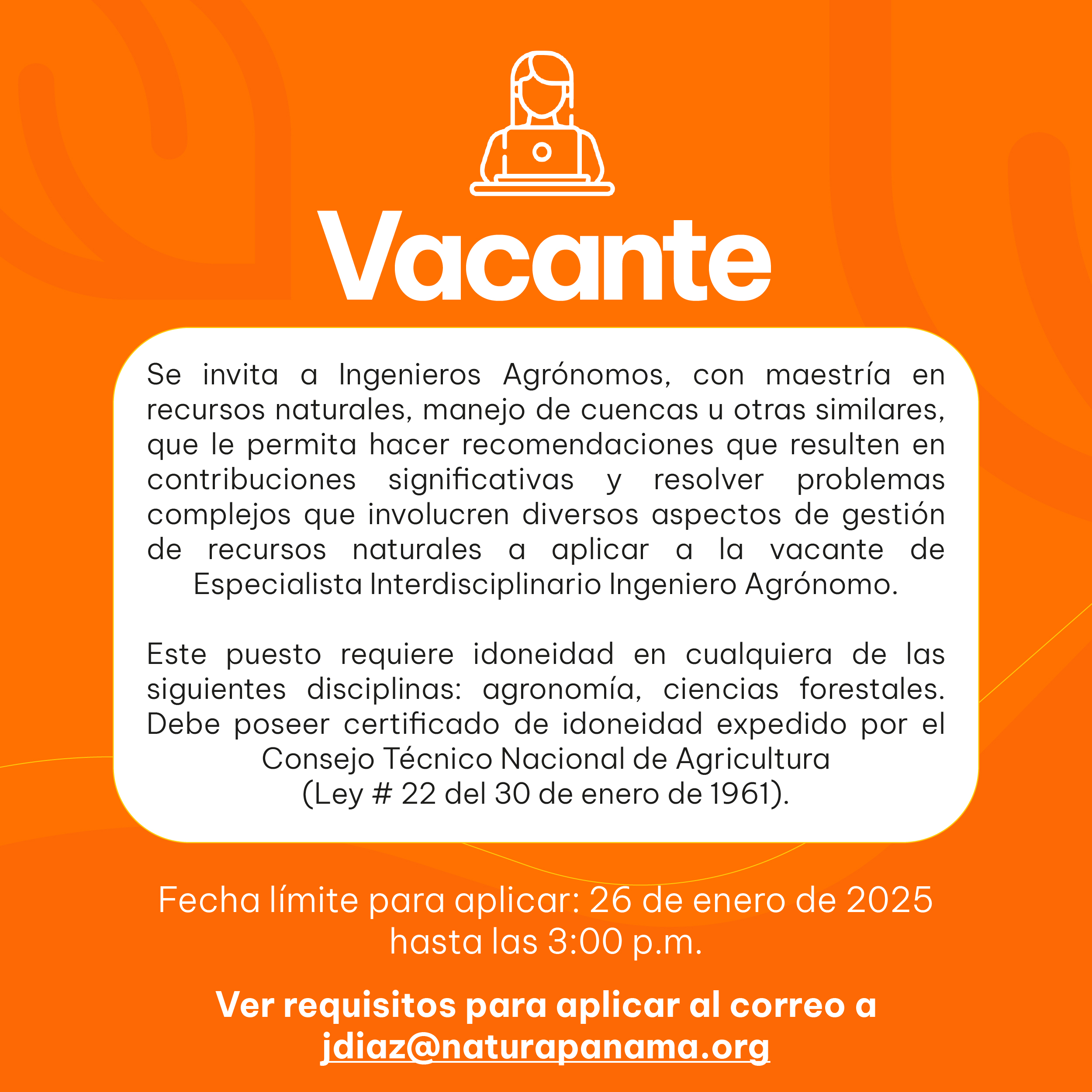 Este puesto requiere idoneidad en cualquiera de las siguientes disciplinas: agronomía, ciencias forestales. Debe poseer certificado de idoneidad expedido por el Consejo Técnico Nacional de Agricultura (Ley # 22 del 30 de enero de 1961).