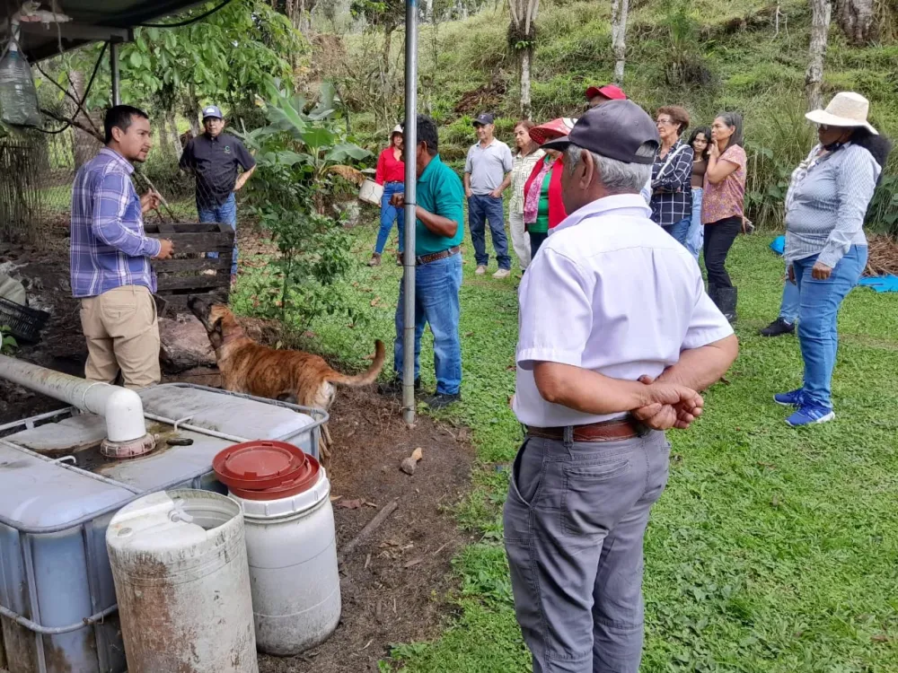 Uno de los talleres destacados se realizó en Caisán Arriba, en la finca de la señora María Quiel. Durante este encuentro, su hijo, Jonathan González, demostró en campo el uso del biodigestor instalado en la finca con el apoyo de Fundación Natura. Esta tecnología contribuye a reducir la contaminación de las fuentes de agua y produce gas metano para uso doméstico a partir de las excretas de cerdos. Además, genera biol y sólidos que se emplean como fertilizantes orgánicos en pastos y cultivos, ejemplificando una tecnología aplicable al manejo sostenible de la tierra y la promoción de una economía circular en la finca.