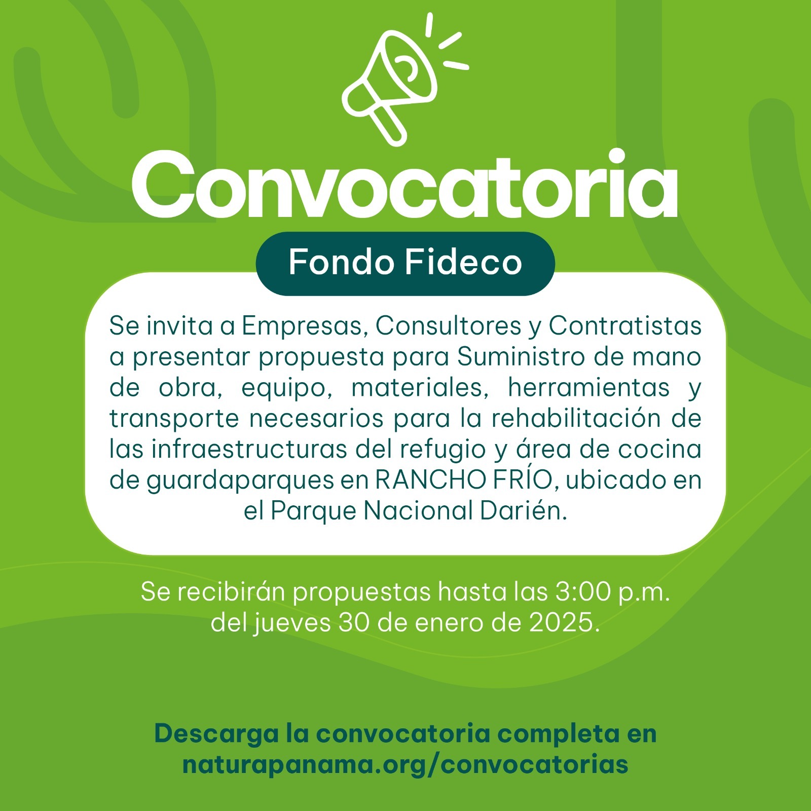 La Fundación NATURA (FN), administradora del Fondo FIDECO para el Programa de Donaciones al Sistema Nacional de Áreas Protegidas, que ejecuta el Ministerio de Ambiente (MiAMBIENTE), hace un llamado a los interesados en presentar propuestas para: “Suministro de mano de obra, equipo, materiales, herramientas y transporte necesarios para la rehabilitación de las infraestructuras del refugio y área de cocina de guardaparques en RANCHO FRÍO, ubicado en el Parque Nacional Darién”.
